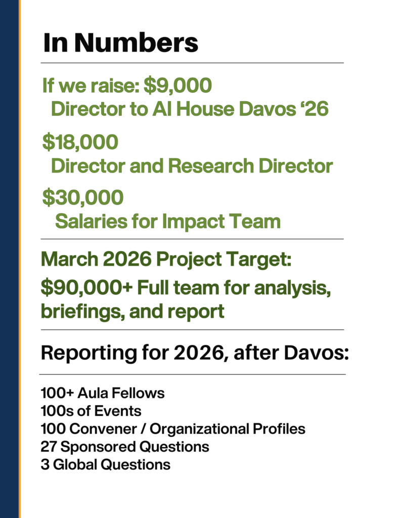 The first part of our budget is urgent, because we’ve just been invited to join AI House Davos ’26 and adjacent conversations, during the week of the World Economic Forum, this January 19th to 24th, 2026.